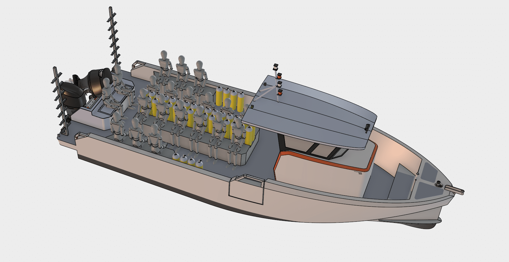 Il est construit en aluminium. Son pont est optimisé pour que les plongeurs puissent se déplacer aisément. Le confort est préservé et le comportement marin apprécié.